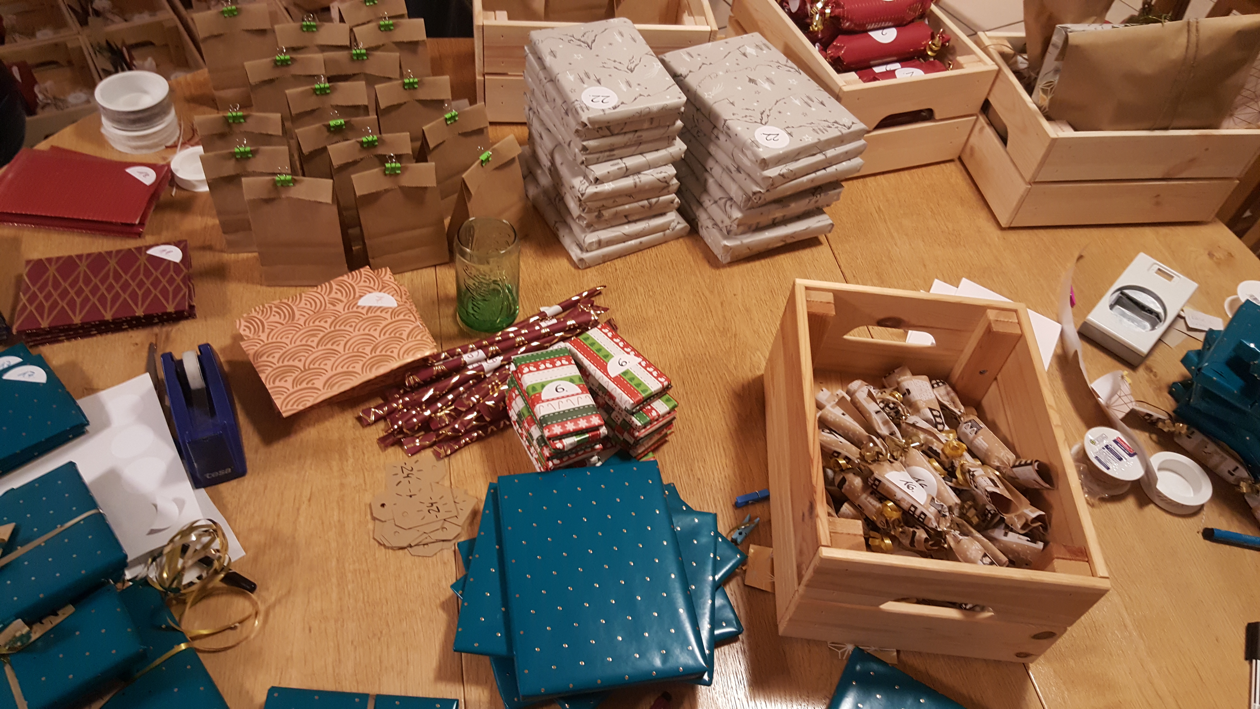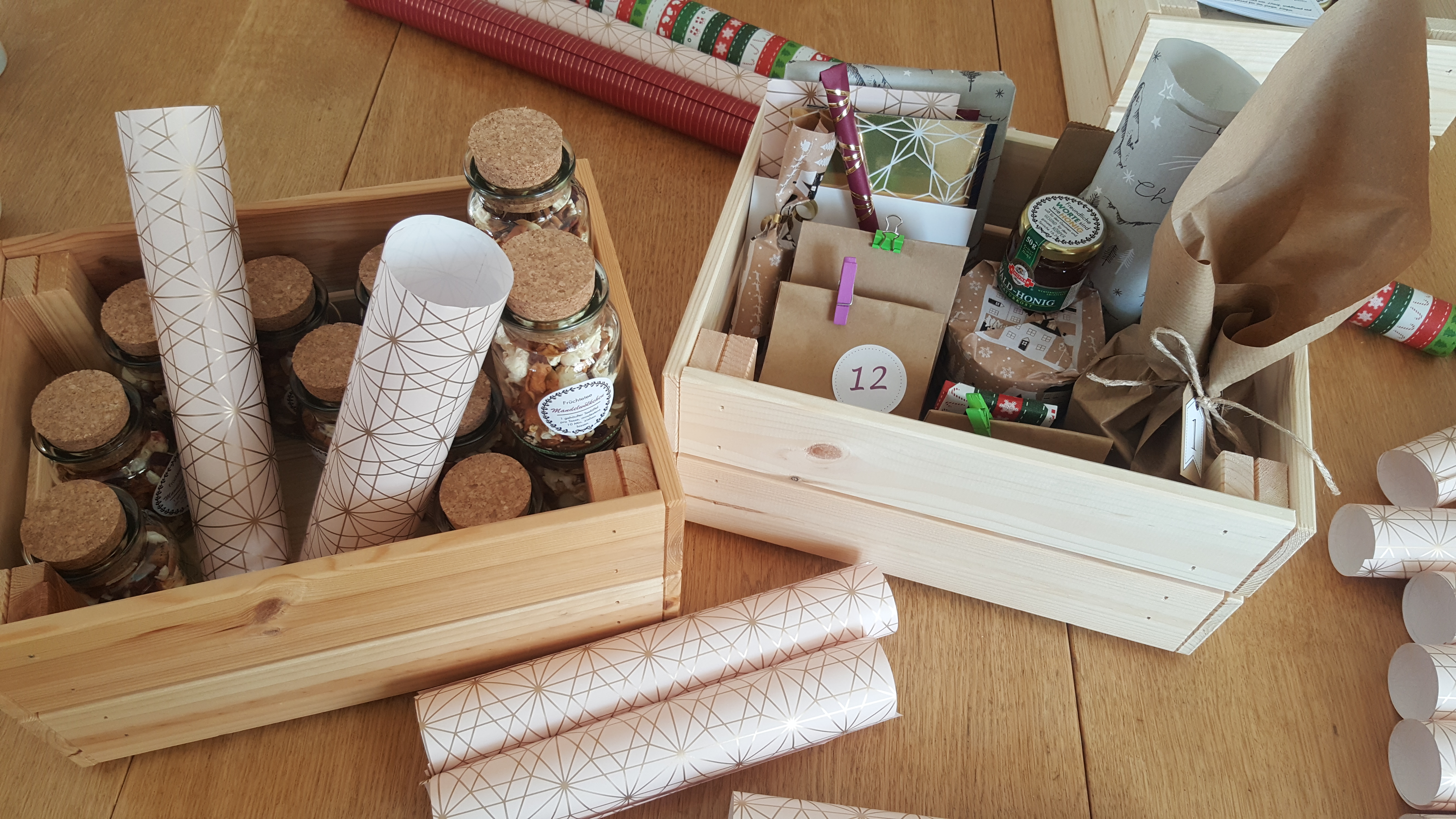 So durfte ich zum Beispiel erleben, dass sowohl eine meiner Tanten als auch eine meiner Cousinen in das Projekt mit eingestiegen sind und jeweils den Gegenstand für einen Kalendertag übernommen haben – genauso auch eine Freundin! Was für ein Segen! Ganz zu schweigen von den fleißigen Helfern, die beim Herstellen der Gegenstände, Postkarten mit Impulsen bekleben, Kisten zusammenschrauben oder „Adventskalendertürchen“ verpacken unterstützt und schließlich am Abend vor dem Gottesdienst noch bis in die Nacht hinein die Kisten befüllt haben!