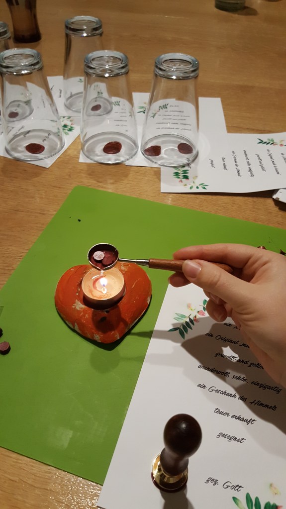 Mich faszinieren Gottes Pläne und seine Art Dinge anzugehen oder Menschen zu erreichen mit seiner Botschaft, mit seiner Liebe. So besonders, wie er einem für eine Aufgabe oder solch ein Projekt auch die passenden Menschen an die Seite stellt, die Ideen schenkt und auch das alles doch noch irgendwie rechtzeitig fertig wird (ich habe meiner Tante ja gesagt: „Falls ich es noch einmal mache, fange ich nächstes Mal früher an 😊!“ – Mal sehen, ob der Vorsatz beim nächsten Mal klappt, falls es ein nächstes Mal gibt 😉).