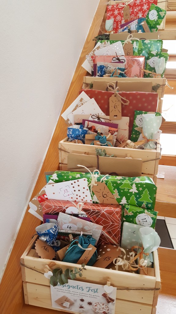 Die Info, dass es wieder Wertvoll-Adventskalender geben wird hat sich ziemlich schnell verbreitet. Nach und nach kamen dann auch die Bestellungen bei mir an und schließlich war irgendwann die 80 Stück erreicht und bei dieser Zahl blieb bis kurz vor dem 1.Dezember – ich hätte eigentlich sogar noch fünf mehr brauchen können😅 So unglaublich, dass die Zahl von Gott einfach gepasst hat, es Menschen auf dem Herzen hatten die Kalender entweder selbst zu behalten oder weiter zu verschenken. Manche der Kalender haben es sogar bis in den Norden Deutschlands geschafft und wurden mit der Post versendet. Schlussendlich haben 1.920 Päckle in 80 Kisten / Körben unser Haus verlassen und durften Frauen (oder manchmal auch ganzen Familien) eine Freude in der Adventszeit machen.